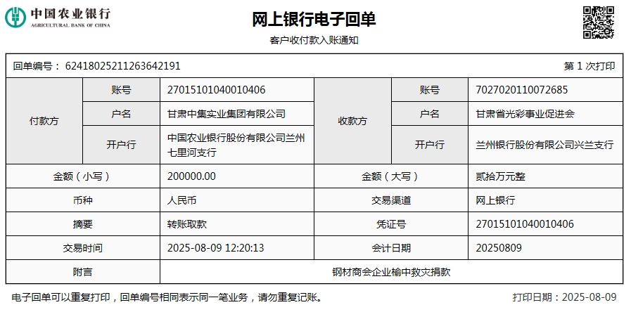 災情發(fā)生后,甘肅中集集團迅速啟動應急響應機制,通過甘肅省光彩事業(yè)促進會捐贈20萬元,助力榆中縣災害救援及災后重建工作,幫助災區(qū)早日恢復生產(chǎn)生活秩序。